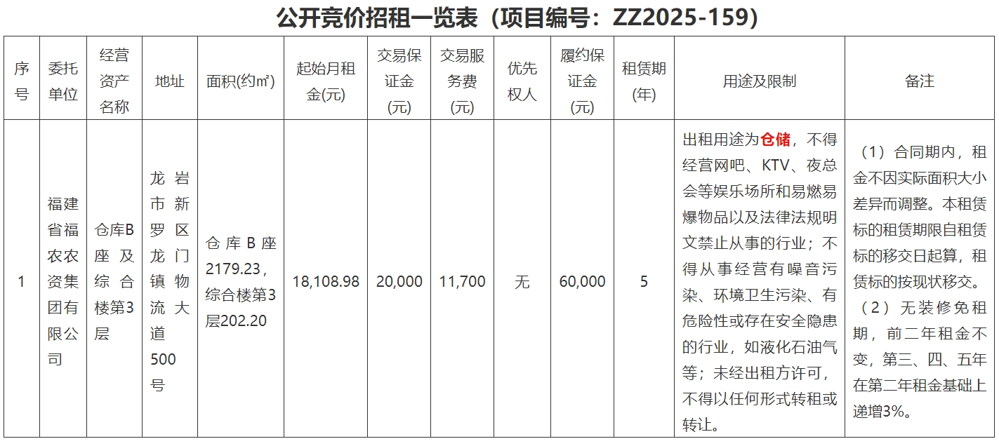 開戶行:廈門銀行股份有限公司龍巖分行,戶名:龍巖市產(chǎn)權(quán)交易中心有限公司,賬號(hào):以權(quán)益云交易平臺(tái)指定的賬號(hào)為準(zhǔn)(報(bào)名參加的競(jìng)租人與繳納交易保證金的名稱要一致)。